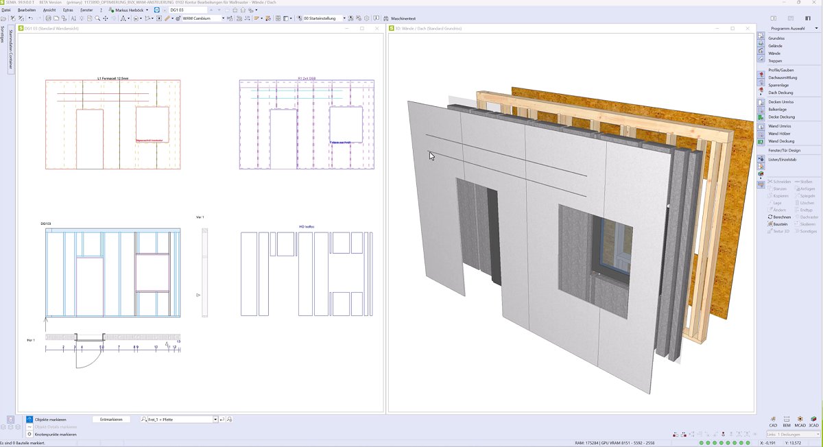 Bauteile bei versetzter Darstellung in Wand- und Elementansicht