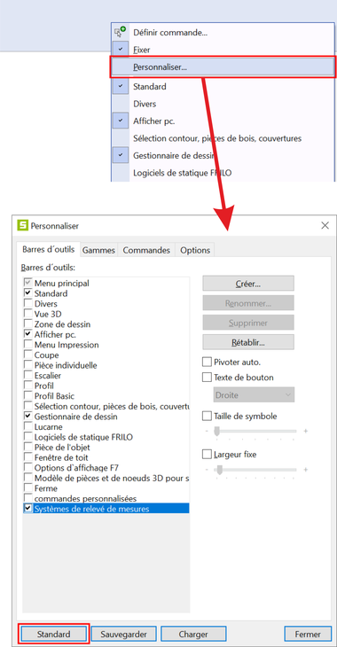 Cliquer dans l'espace libre en haut à droite de la barre d'outils. Cliquer droit avec la souris sur l'option: "Personnaliser"► "Standard" dans le menu affiché pour restituer l'état original des barres d'outils comme elles ont été livrées par SEMA.