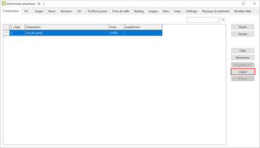 Pour faire cela, sélectionner l'option "Fichier" ►"Gestionnaire graphique" ► "Construction". Sélectionner la fonction <Copier> pour copier le bâtiment avec tout son contenu. |